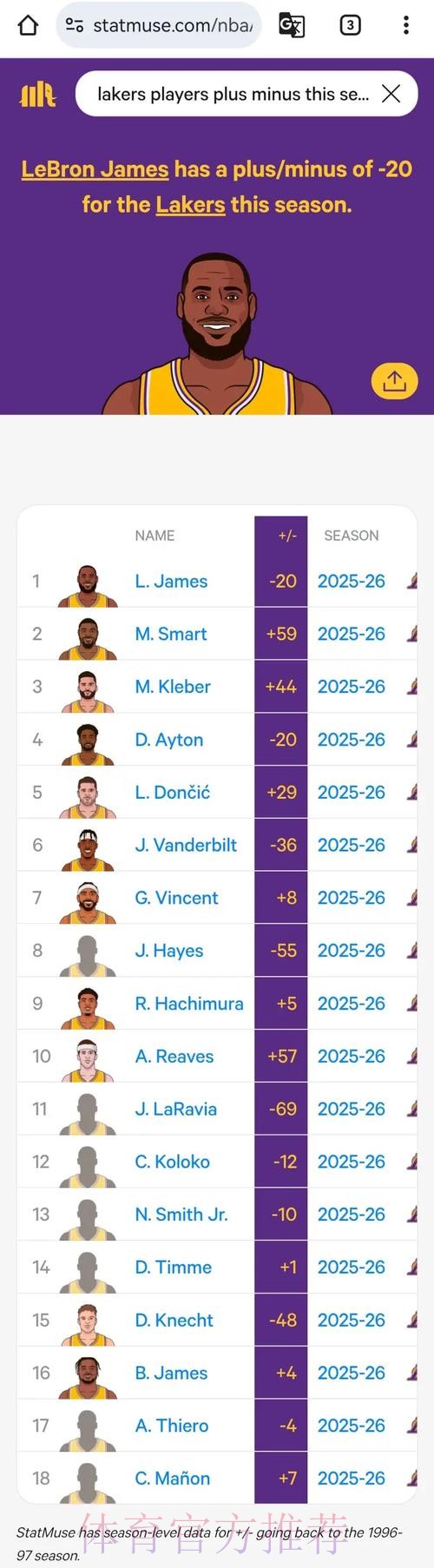 湖人2026年总正负值榜:詹姆斯+35第一,斯马特克内克特二三